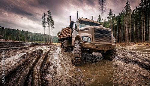 Classic heavy duty logging truck in mud
