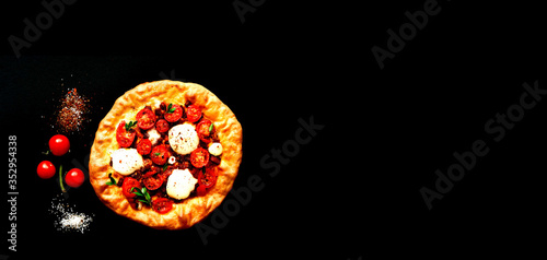 Classic homemade pizza on dark background. Italian food. Happiness is in small thngs.