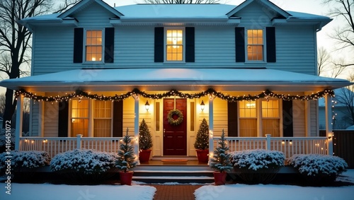 Classic house adorned with twinkling christmas lights creating a magical holiday atmosphere in a winter wonderland