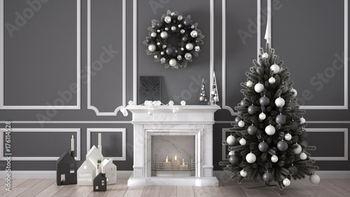 Classic living room with fireplace, Christmas tree and decors, winter, new year scandinavian white and gray interior design