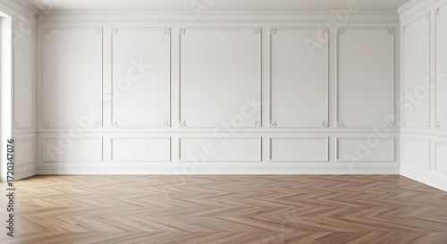 Classic luxury white empty interior with wall molding panels and wooden floor. Modern white background. 3d render