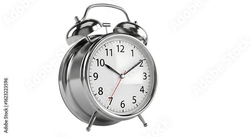Classic metal alarm clock with a vintage design isolated on transparent background, showing the time with its hands and numbers on the clock face