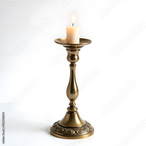 Classic ornamental candle holder with lit candle on minimalist background, photography of still life concept.