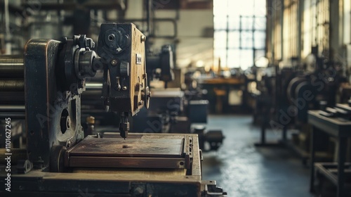 Classic press machine in a retro factory environment, showcasing the vintage machinery aged charm and the industrial atmosphere filled with history