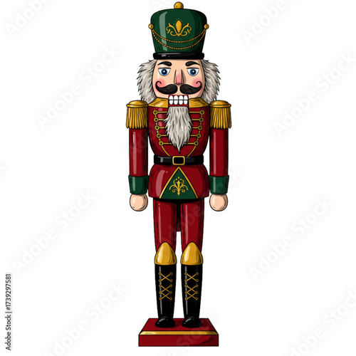 Classic Red Nutcracker Soldier with Black Hat Gold Details Blue Pants and Mustache Festive Christmas Holiday Toy Vector Illustration Isolated on Transparent Background