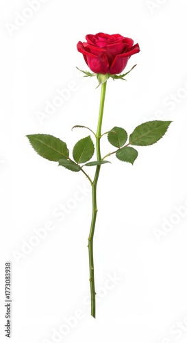Classic romantic image featuring a single vibrant crimson red rose stem and bloom, elegantly floating against a stark, clean white backdrop ,anniversary ,surprise ,romance