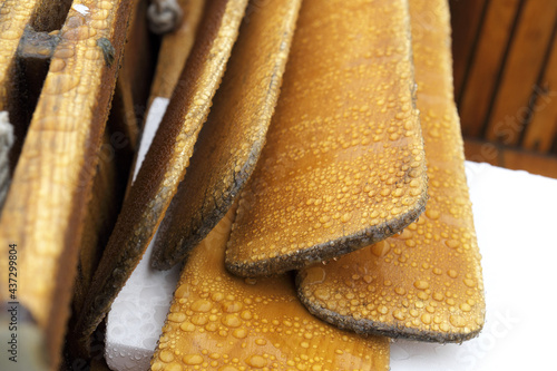 Classic rowboat oars sitting in a rowboat in the rain