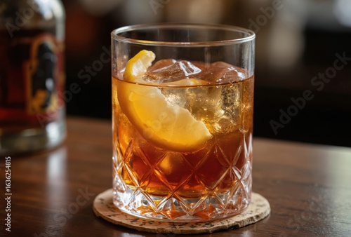 Classic Sazerac cocktail in crystal glass with lemon twist. Refreshing alcoholic drink contains rye whiskey, absinthe, ice. Elegant amber liquid on wooden bar table for gourmet enjoyment.