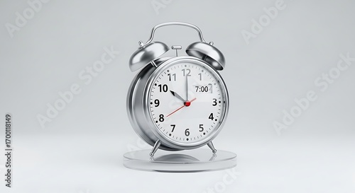 Classic Silver Alarm Clock on White Background with Red Second Hand.