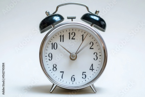Classic silver alarm clock with black bells, indicating time in a minimalist setting