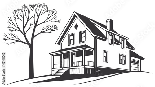 Classic Single Family House with Tree in Front Yard on a Hillside Landscape
