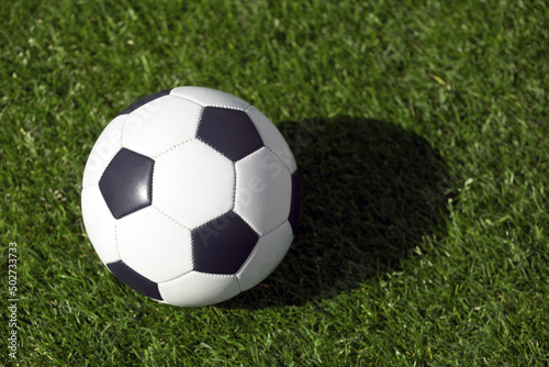 Classic soccer ball on grass field. View from above on retroc classic football ball. Sports soccer background
