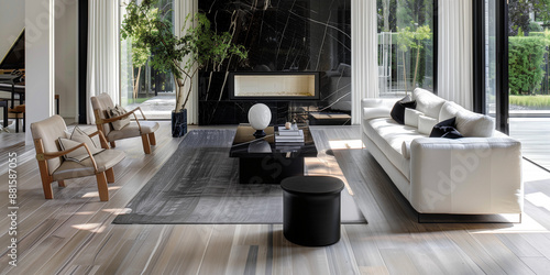 Classic Sophistication: Nero Marquina Living Room - Fireplace Surround and Floor, Natural Lighting - Ideal for Contemporary Homes