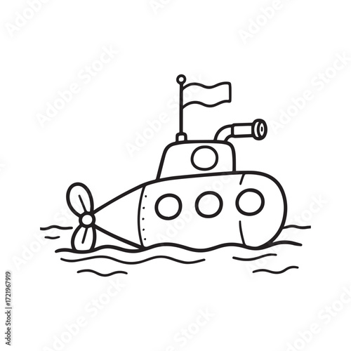 Classic Submarine Line Art Illustration with Periscope, Portholes, Flag and Propeller.