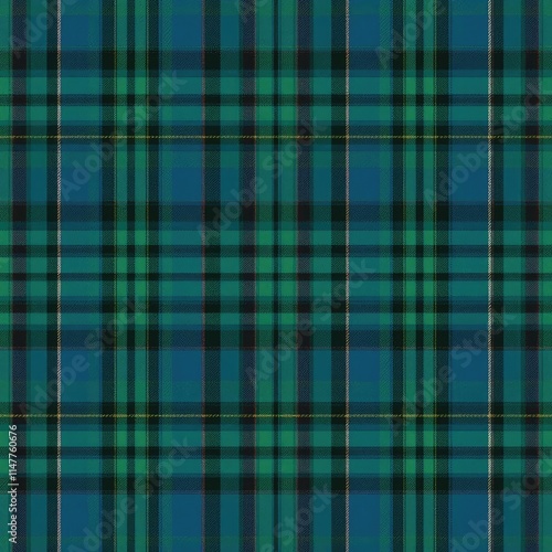 Classic tartan plaid pattern in blue and green hues on a dark background, copy space