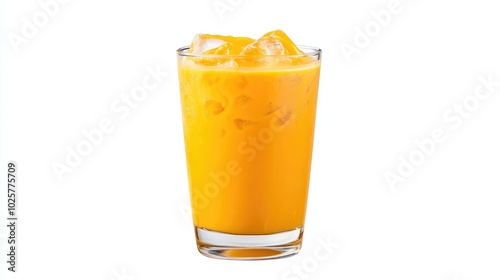 Classic Thai milk tea in a transparent glass with ice, showing vibrant orange color, isolated on a white background.