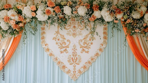 Classic Thai-inspired wedding backdrop with ornate patterns and a serene color palette