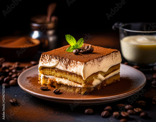 Classic tiramisu dessert with delicate layers of coffee-soaked sponge cake and mascarpone cream. Decorated with cocoa and chocolate shavings. A perfect combination of flavors and textures.