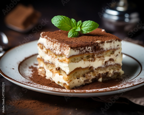 Classic tiramisu on a white plate, garnished with mint and dusted with cocoa powder, drizzled with chocolate. Generative AI