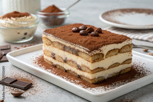 Classic Tiramisu with Coffee Beans and Cocoa Powder on a White Plate
