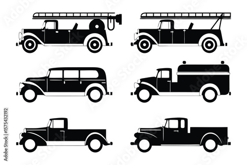 Classic Truck Car Silhouette: Six vintage automotive silhouettes, each capturing the essence of classic truck car, from fire engine to pickup, evoking nostalgia.