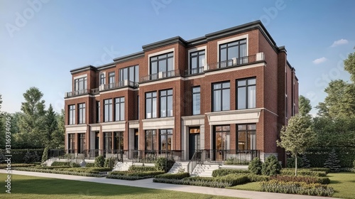 Classic urban townhouse with a historic brick facade, iron railings, and large bay windows.