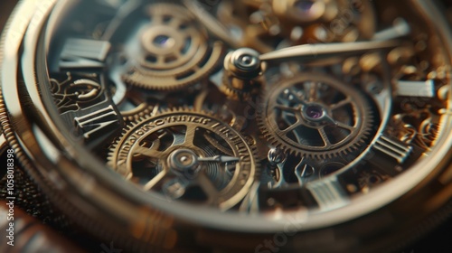 Classic watch face close-up, showcasing intricate gears and details, set against a soft leather background, highlighting craftsmanship and luxury.
