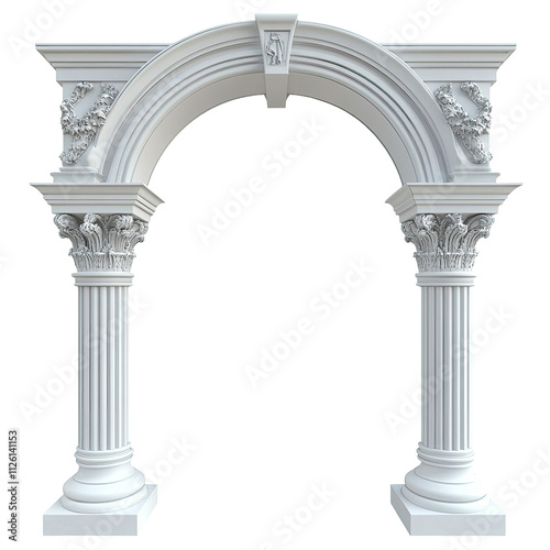 Classic white arched architectural frame with decorative column isolated on transparent or white background.