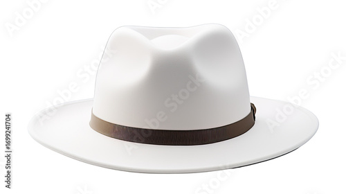 Classic white cowboy style felt hat with brown ribbon band isolated on white background