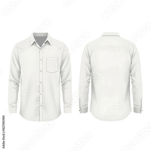 Classic white long-sleeved dress shirt mockup. Isolated front and back view of a blank men's formal apparel template.