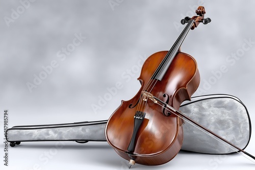 Classic Wooden Cello with Bow and Hard Case on Neutral Background, Musical Instrument Close-Up