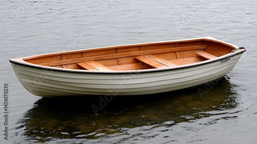Classic Wooden Rowboat on Calm Water, Lakeside Serenity