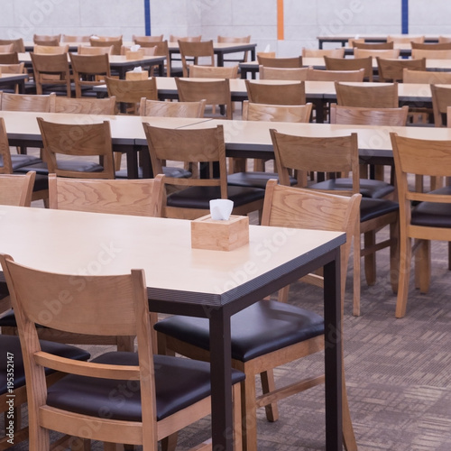 Classic wooden tables and chairs set arrange in convention hall, food court table set prepare for people