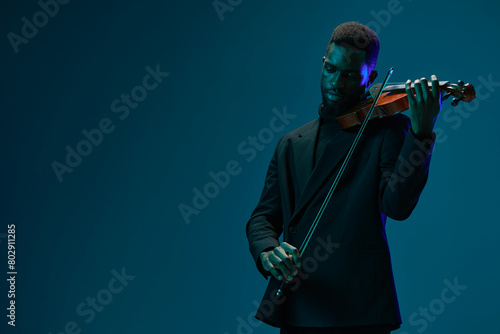 Classically elegant musician in black suit playing violin against dark blue background on stage