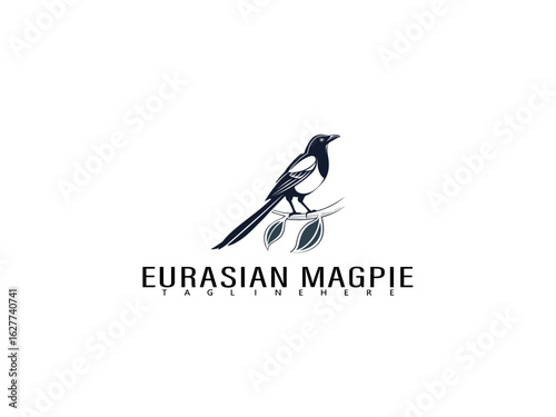 Classically styled black and white vector logo of Eurasian Magpie perched on a natural branch, perfect for wildlife-oriented branding, artistic bird logo collections, and eco-conscious identity.