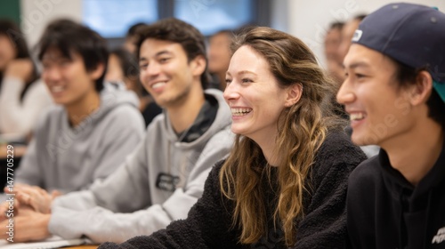 Classroom environment, group of students laughing, middle shot, side view,Group of students laughing, middle shot, side view