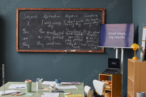 Classroom scene showing blackboard with English grammar lesson on verb tenses, digital screen displaying motivational message, desks with study materials, language school context