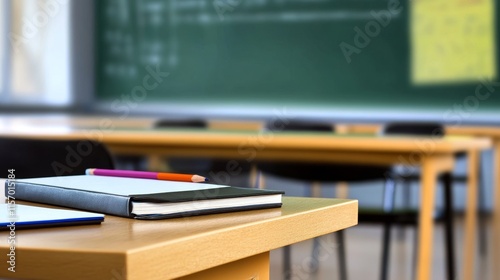 Classroom scene with desk and blackboard.