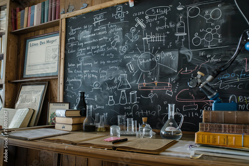 Classroom with a blackboard of hand-drawn chemistry teaching, books, and instruments