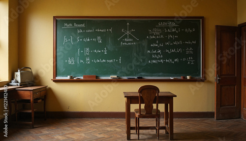 Classroom with empty desk and chalkboard covered in math equations, Day of Pi