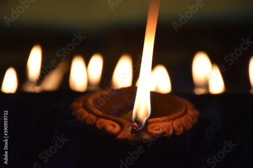 Clay Diya or Oil Lamp lits during the Diwali night. Traditional Diyas lit on gold and black background