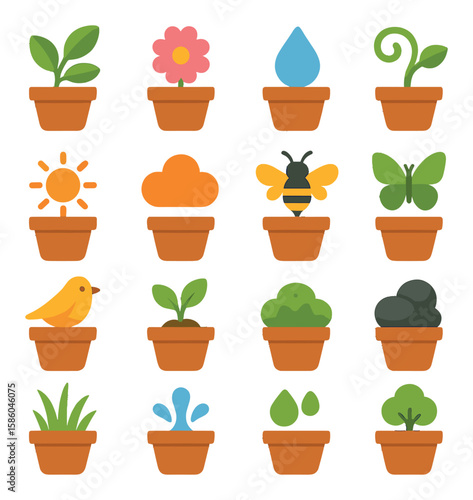 Clay Pot Nature Pairings modern flat style . leaf cluster, flower bloom, water droplet, vine tendril, sun ray, cloud puff, bee silhouette, butterfly line, bird perched