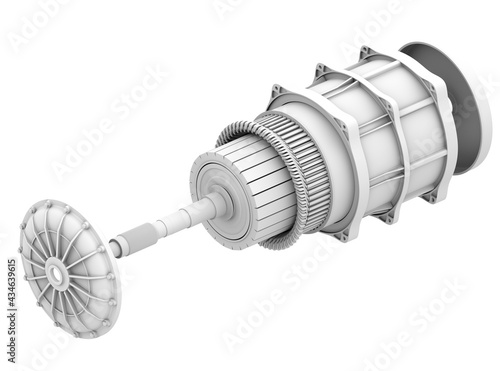 Clay rendering exploded view of Electric Vehicle Motor on gray background. 3D rendering image.