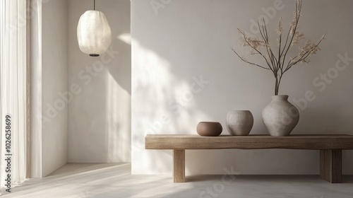 Clean and minimalist hallway with a wooden console table, a vase, and a hanging lamp. White walls provide a blank canvas for the sleek, modern decor.