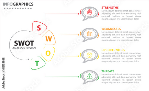 Clean and modern SWOT analysis infographic template. Editable design for presentations, business reports, or strategy plans. Highlights Strengths, Weaknesses, Opportunities, and Threats clearly.