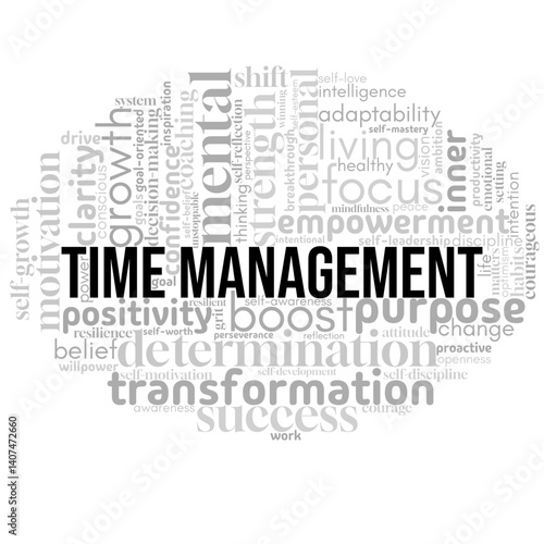 Clean and motivating word cloud centered on "time management," filled with terms for productivity, planning, and efficiency. Great for business, coaching, and personal development projects