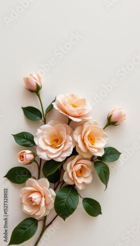 clean arrangement of camellias in a minimalist style, with pastel peach and fog tones, minimal lines, open space for text, sleek vibe, high resolution