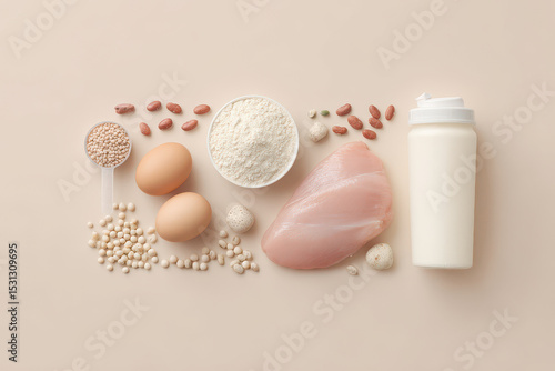 clean background featuring various protein sources like chicken fish eggs and legumes arranged artistically