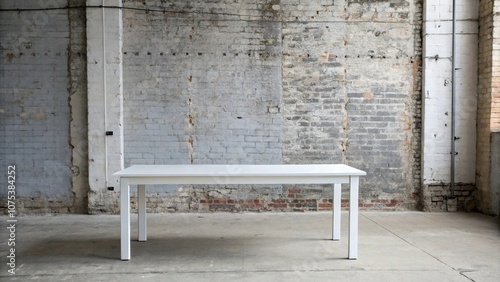 Clean blank white table sitting against a large industrial grey wall with exposed brick pattern, industrial, grey, interior design, exposed brick, minimalist