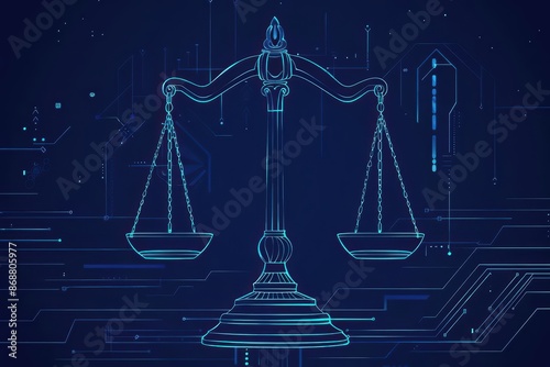 Clean cyber banner showcasing digital scales of justice with sleek lines and glowing elements with copy space